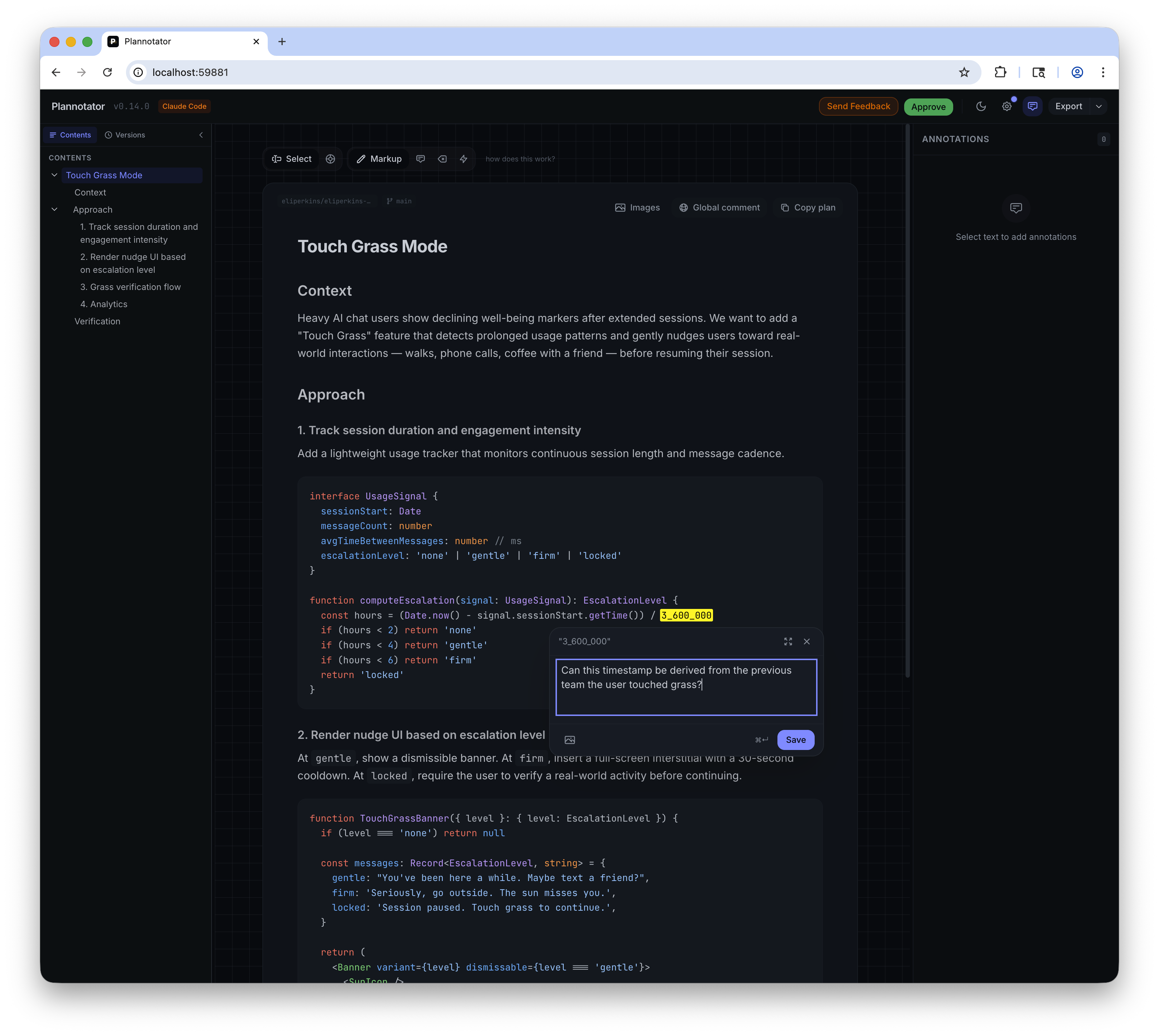 Plannotator hooks into Claude Code's Plan Mode, so once a plan is devised by Claude Code, Plannotator pops open a localhost website for you. Markup, leave questions or comments, and accept or reject the plan. Any comment will reject the plan, giving your agent another go at creating its best work. Approving a plan sets it off and running.